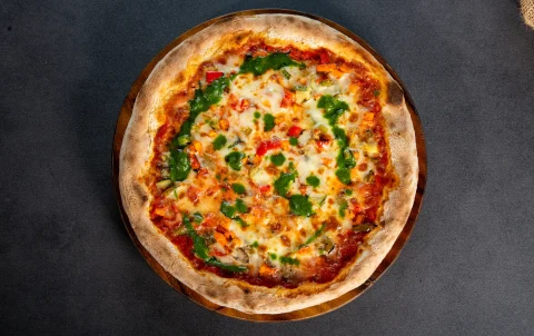 Pizza Vegetariana highlights the natural flavors of grilled vegetables in a well-balanced Italian...