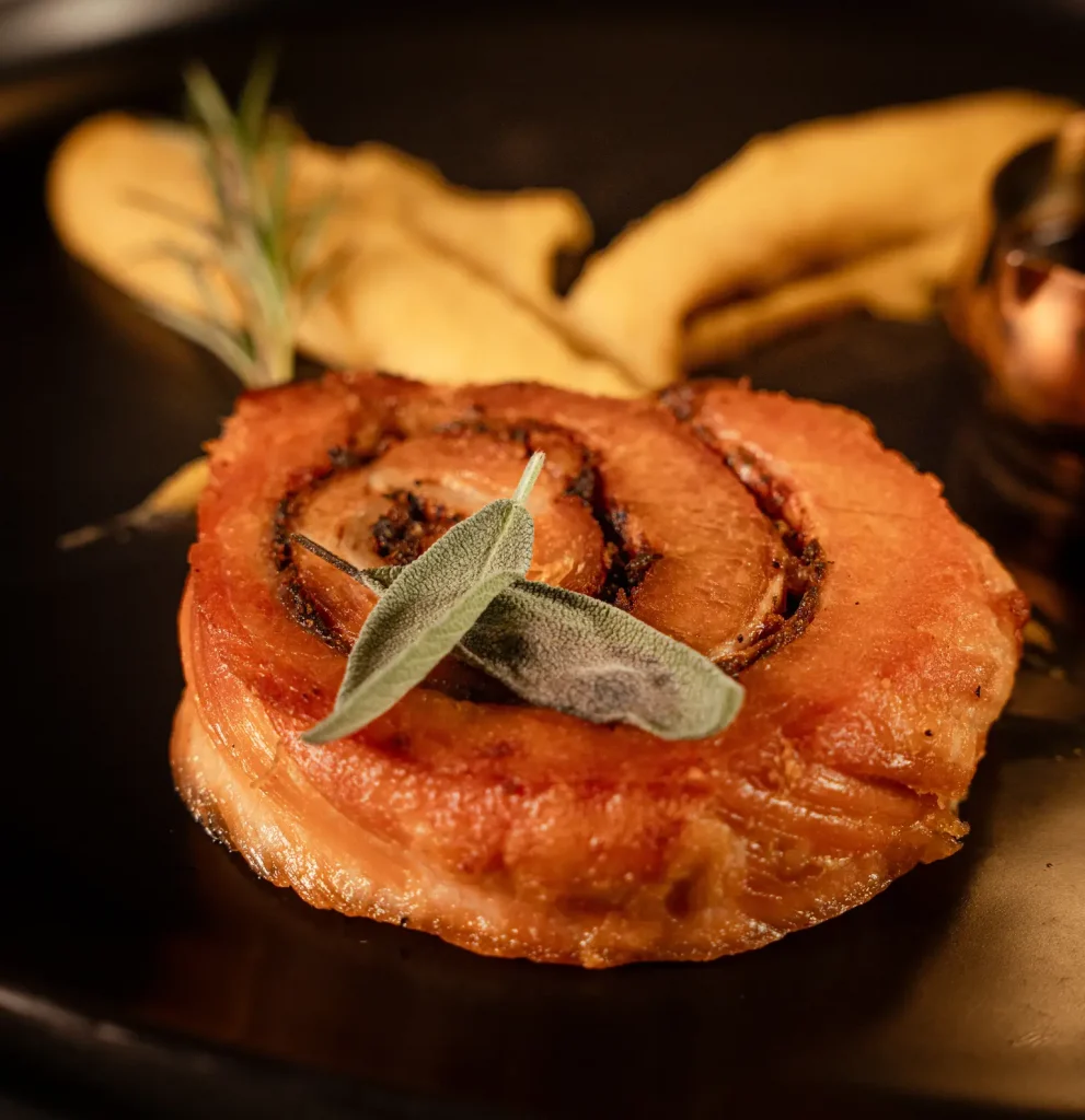 Piemontese tomino cheese, crispy Speck and mix leaves Phô mai piemontese tomino, thịt nguội Speck hun khói và rau tổng hợp