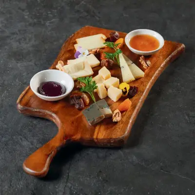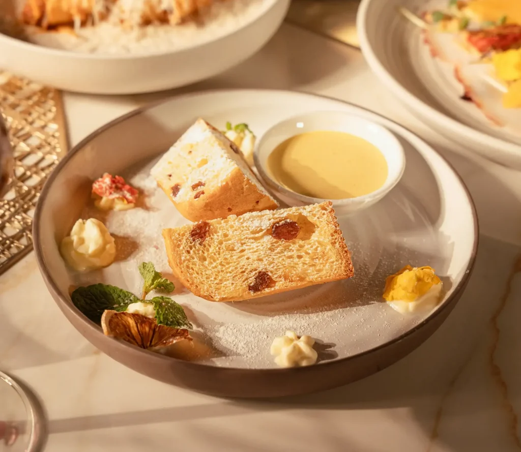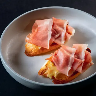 Toasted bread with Brie, truffle paste and Speck Bánh mì nướng, dùng kèm phô mai Brie, nấm truffle và thịt nguội hun khói Speck