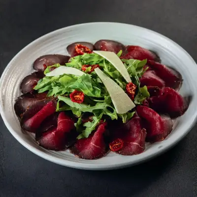 Homemade beef Bresaola with rocket, dried tomatoes, Parmesan and passion fruit dressing Bò Bresaola nhà làm cùng rau rocket, cà chua sấy, phô mai Parmesan và xốt chanh leo
