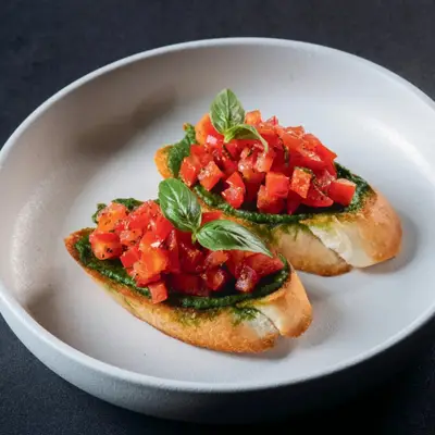 Toasted bread with basil pesto and marinated tomato Bánh mì nướng, dùng kèm xốt pesto húng tây và cà chu