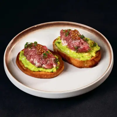 Toasted bread with fresh tuna and avocado Bánh mì nướng, dùng kèm cá ngừ tươi và bơ