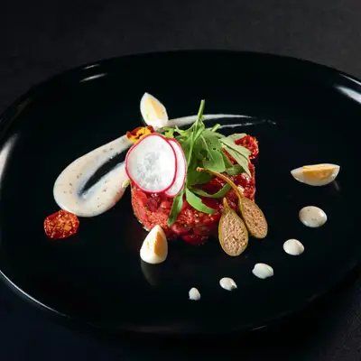 Fine chopped raw Black Angus tenderloin with Parmesan fondue, quial egg and rocket Thăn nội bò Black Angus băm nhỏ cùng phô mai Parmesan, trứng cút và rau rocket